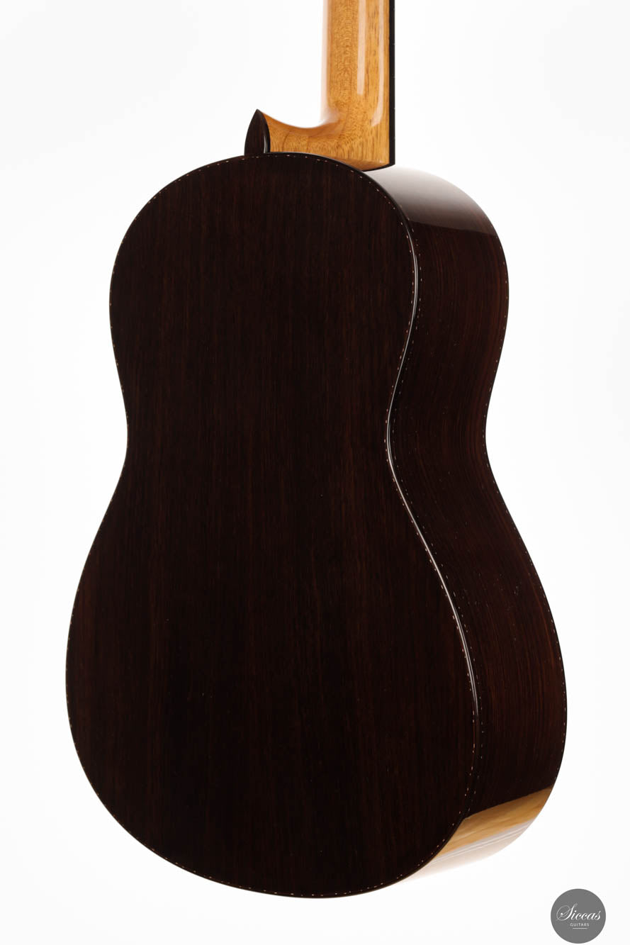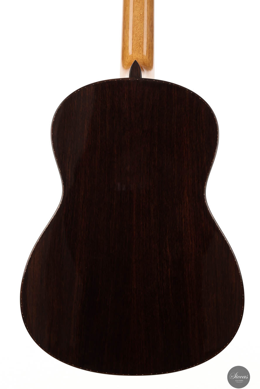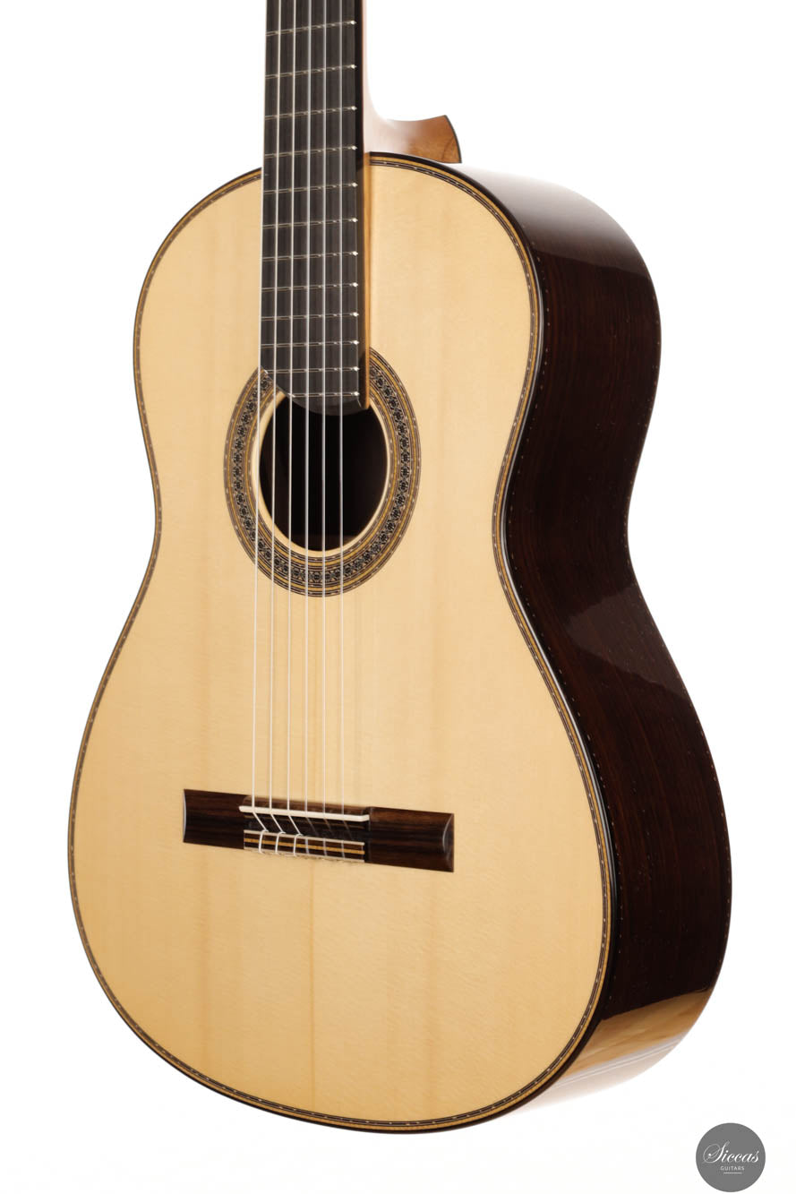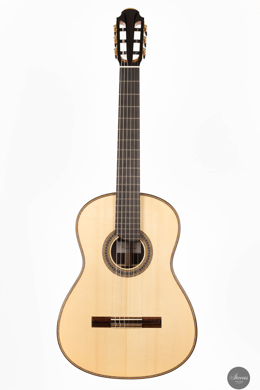 Guitar No. 13, the sister instrument to No. 14, shares a nearly identical aesthetic with its counterpart, beautifully crafted to mirror each other in every visible aspect. The true distinction lies beneath the surface, where luthier Paul has varied the thickness of the top, an experimental touch designed to subtly influence the acoustic properties of each guitar. This meticulous attention to detail is part of a broader commitment to achieving the highest level of craftsmanship, with every element finely tuned to perfection. For those interested in the specifics of these variations, an interview with Paul provides a deeper insight into his innovative approach, highlighting the subtle yet impactful differences between these two exceptional instruments.Both guitars stand out as masterpieces of lutherie, boasting clean and precise acoustic qualities that make them suitable for a wide range of musical styles. The clarity of sound produced by these instruments is particularly remarkable, facilitating the performance of complex polyphonic works with ease. This clarity ensures that every note is articulated distinctly, supporting musicians in their expression of intricate musical passages. Whether used in a solo performance or within an ensemble, guitars No. 13 and No. 14 offer musicians the ability to convey their musical vision with precision, making them not just tools, but true partners in the artistic process.