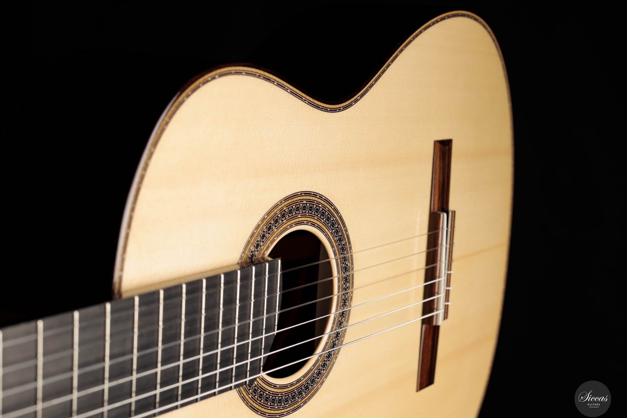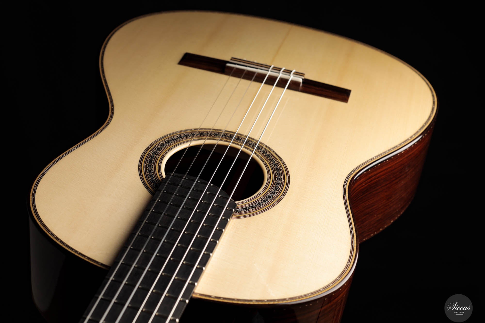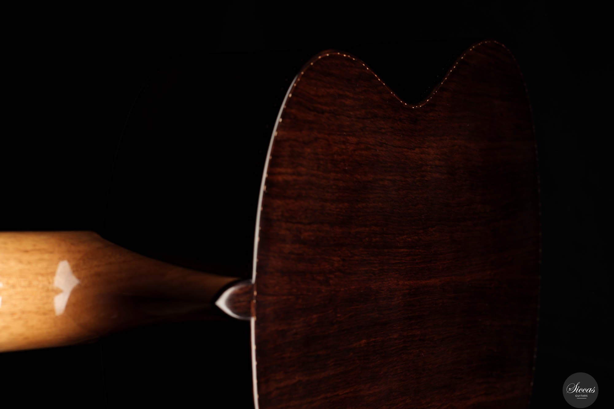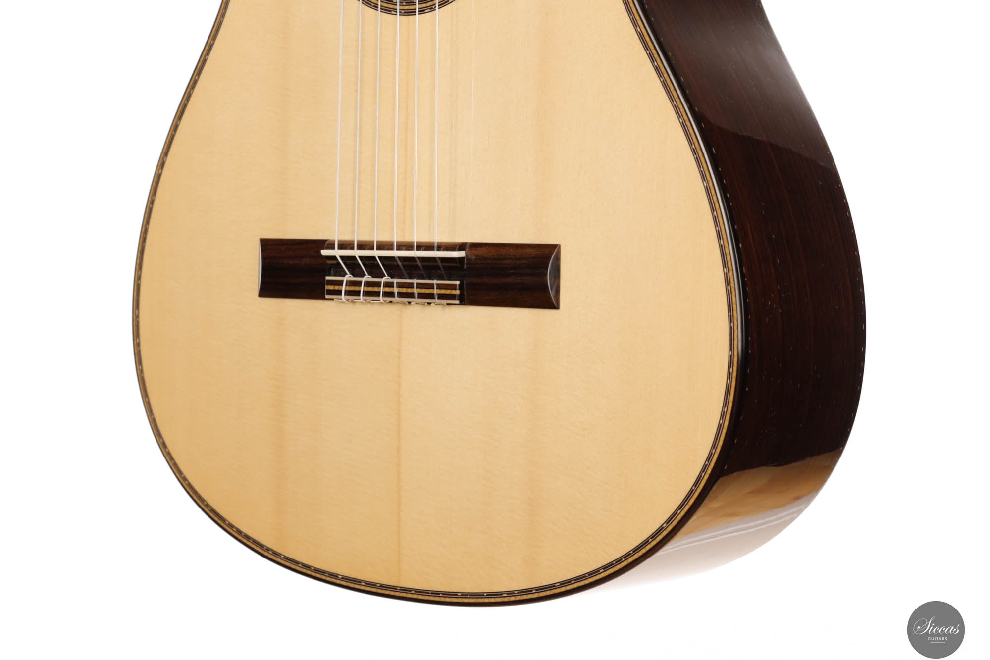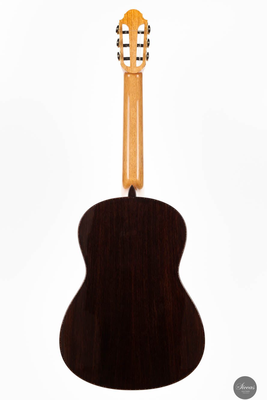 Guitar No. 13, the sister instrument to No. 14, shares a nearly identical aesthetic with its counterpart, beautifully crafted to mirror each other in every visible aspect. The true distinction lies beneath the surface, where luthier Paul has varied the thickness of the top, an experimental touch designed to subtly influence the acoustic properties of each guitar. This meticulous attention to detail is part of a broader commitment to achieving the highest level of craftsmanship, with every element finely tuned to perfection. For those interested in the specifics of these variations, an interview with Paul provides a deeper insight into his innovative approach, highlighting the subtle yet impactful differences between these two exceptional instruments.Both guitars stand out as masterpieces of lutherie, boasting clean and precise acoustic qualities that make them suitable for a wide range of musical styles. The clarity of sound produced by these instruments is particularly remarkable, facilitating the performance of complex polyphonic works with ease. This clarity ensures that every note is articulated distinctly, supporting musicians in their expression of intricate musical passages. Whether used in a solo performance or within an ensemble, guitars No. 13 and No. 14 offer musicians the ability to convey their musical vision with precision, making them not just tools, but true partners in the artistic process.