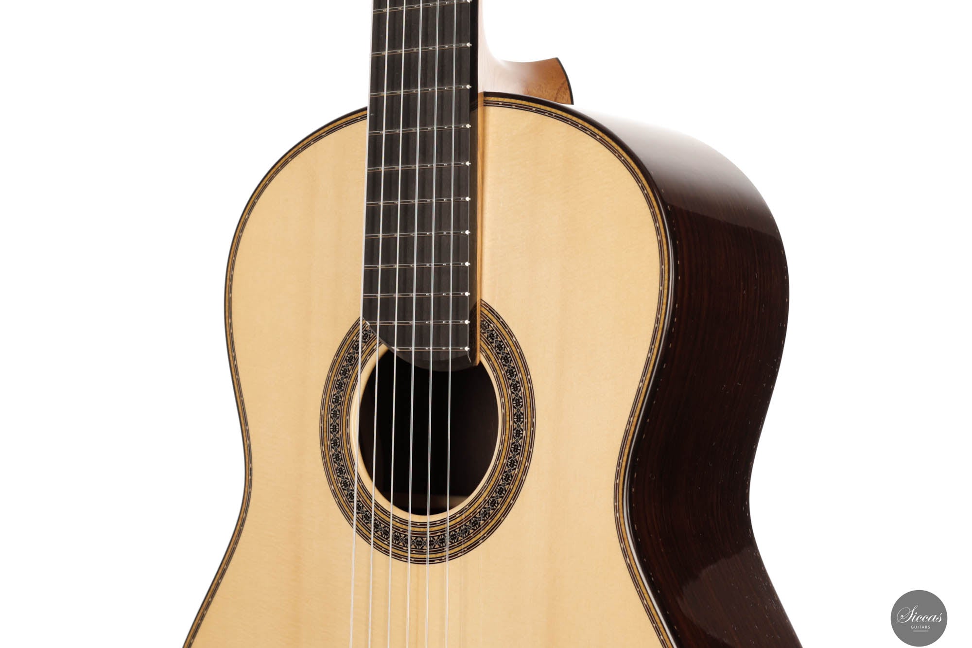 Guitar No. 13, the sister instrument to No. 14, shares a nearly identical aesthetic with its counterpart, beautifully crafted to mirror each other in every visible aspect. The true distinction lies beneath the surface, where luthier Paul has varied the thickness of the top, an experimental touch designed to subtly influence the acoustic properties of each guitar. This meticulous attention to detail is part of a broader commitment to achieving the highest level of craftsmanship, with every element finely tuned to perfection. For those interested in the specifics of these variations, an interview with Paul provides a deeper insight into his innovative approach, highlighting the subtle yet impactful differences between these two exceptional instruments.Both guitars stand out as masterpieces of lutherie, boasting clean and precise acoustic qualities that make them suitable for a wide range of musical styles. The clarity of sound produced by these instruments is particularly remarkable, facilitating the performance of complex polyphonic works with ease. This clarity ensures that every note is articulated distinctly, supporting musicians in their expression of intricate musical passages. Whether used in a solo performance or within an ensemble, guitars No. 13 and No. 14 offer musicians the ability to convey their musical vision with precision, making them not just tools, but true partners in the artistic process.